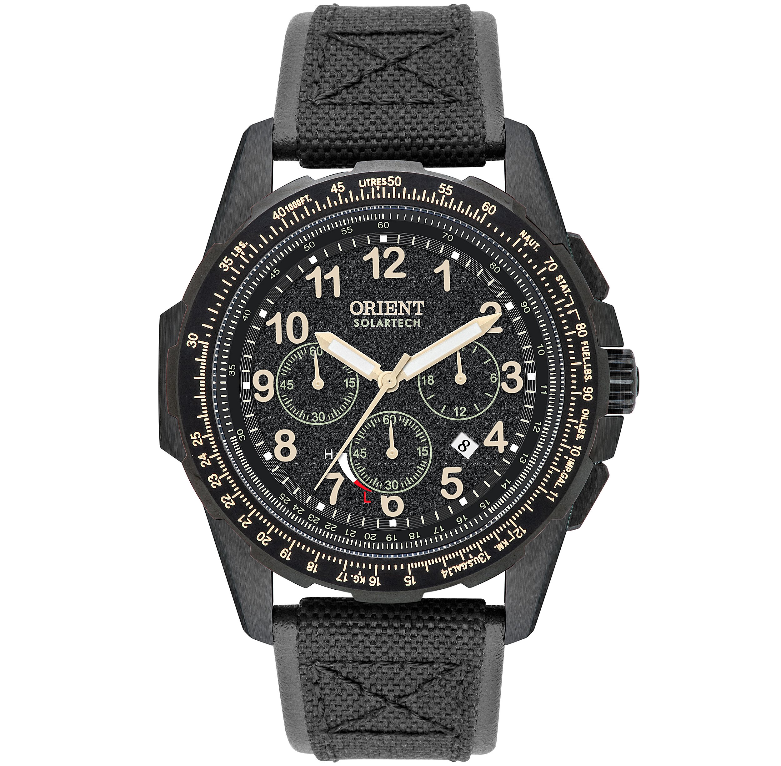 Outros: Index em relevo, Bezel giratório bi-direcional com tábua de cálculos, Fundo Rosqueado e Protetor de coroa